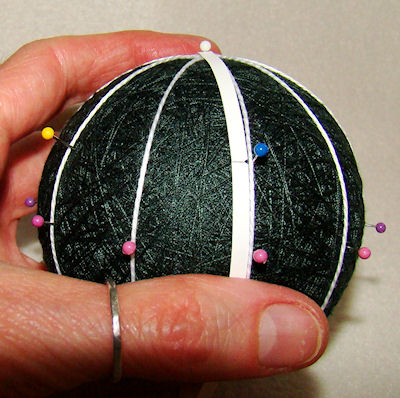 Turn the ball upside down, so that the set of pins just placed is in the bottom half (southern hemisphere) of the mari. Pin the marking strip to the pole at the top. The procedure for placing the pins is the same. Again, place a pin in the notch on a line that has an equator pin. Be sure to pair the colors: for example, the green pin placed here has its mate directly opposite on the other side of the mari. |