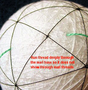 | Passing Threads Under the Mari Surface: Passing threads under the mari wrap can be done for 2 reasons: it's critical to anchoring the threads when starting and ending in the normal stitching process. It can also be used in actual design work. It's a handy trick to make threads disappear when working designs and you only need parts of shapes to show in the temari pattern. This is frequently seen in more intricate designs found in Japanese books.For whatever reason it's being done, it's critical to do it properly so that no "bleed through" shows - none of the working thread should be seen traveling under the mari wrap. | |
