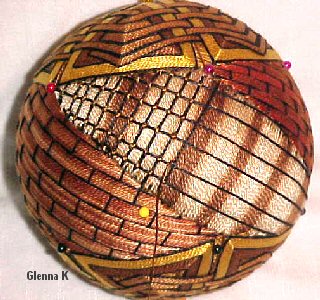Weave 6 concentric pentagons: [1 black, 6 medium brown, 1 black] around the mark lines through the center of the triangles. As thread leaves the center of a triangle, weave under the right side bands, up between the triangles, and over the left side bands. Repeat triangles and pentagons at the SP. |