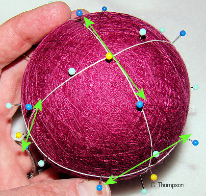 | While this swirl design is forgiving regarding the roundness of the ball, and the accuracy of the markings are, it does require neat and even stitch placement for the best outcome. It also usually takes working a few to really get the feel of it. The is stitching "off the grid" - that is, not around a marking line, so you will be gauging your stitch size and placement by eye. The "smoothness" of the swirl comes from the consistency in the stitch size and placement, and the "swirly" of the swirl comes from being sure that there is a constant connection in the design to the previous row. | |
