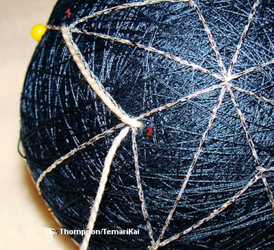 Materials: 24 cm circumference mari, wrapped in red For stitching: Pearl cotton #5 in colors of your choice; black, gray and white are used here. Marking thread in fine gold metallic Prepare a Simple 8 Division with gold metallic thread |